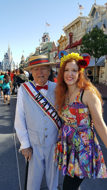 When we arrived at the Magic Kingdom, it was 9:30, and the crowds were crazy. The bag check line was quite long, but we finally got through it and into the park for our first dramatic look at Main Street and the castle! That's always a special moment, but this time around Tom pointed out to me that the Mayor of Main Street was mingling with park guests right near us. We stopped the Mayor so I could get a picture with him, and had a short conversation. He asked us where we were from, and said his "favorite ex-wife" was from Ohio.